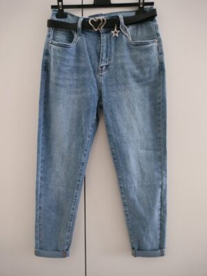 Spodnie jeansowe M.Sara Cechy produktu: Prosty krój Średni stan Skład materiału: 68% bawełna, 28% poliester, 2% wiskoza, 2% elastan Uciągają się ok. 8 cm Wymiary rozmiar L: Długość nogawki zewnętrznej 97 cm Długość nogawki wewnętrznej 69 cm Szerokość w pasie 39 cm Szerokość w biodrach 50 cm Stan 28 cm