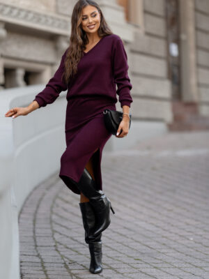 129.00złOpis produktu: Stylowy komplet dzianinowy w głębokim, śliwkowym kolorze – idealny wybór na jesień i zimę. Składa się z wygodnej, sweterkowej bluzy z długim rękawem oraz dopasowanej spódnicy midi z rozcięciem, które nadaje całości kobiecego charakteru. Komplet łączy w sobie elegancję i komfort – miękki, elastyczny materiał zapewnia swobodę ruchów i przyjemność noszenia przez cały …