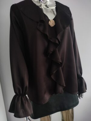 69.00złWiskozowa bluzka z falbaną i ozdobną broszką – ciemny brąz Elegancka, kobieca bluzka wykonana z wysokiej jakości wiskozy, która jest lekka, przewiewna i przyjemna dla skóry. Model wyróżnia się dekoracyjną falbaną biegnącą wzdłuż dekoltu oraz ozdobną broszką w złotym kolorze, dodającą całości subtelnego szyku. Luźniejszy krój zapewnia wygodę i swobodę ruchów, a rękawy nadają bluzce …