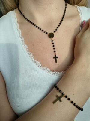 69.00złStal chirurgiczna komplet naszyjnik bransoletka krzyż koraliki złoty Materiał: stal chirurgiczna Długość naszyjnika (z zapięciem): 46 cm Długość bransoletki: 23 cm Doskonała jakość. Biżuteria błyszczy się. Pasuje zarówno do codziennych stylizacji, jak i na eleganckie wyjścia. Idealny pomysł na prezent. Komplet zapakowany w ozdobne pudełeczko.