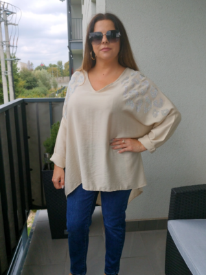 Pierwotna cena wynosiła: 99.00zł.69.00złAktualna cena wynosi: 69.00zł.Tunika damska z aplikacją beżowa Tunika przewiewna, wykonana głównie z wiskozy, przez co idealnie nadaje się na wiosenne i letnie wieczory. Aplikacja wykonana z pięknie połyskujących diamencików. Luźny komfortowy fason. Skład materiału 87% wiskoza i 13 poliamid. Produkt Włoski.