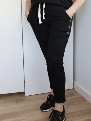 65.00złSpodnie damskie dresowe czarne L CECHY PRODUKTU: Proste nogawki, które można podwinąć Gumka w pasie Z przodu dwie kieszonki Ozdobne, złote kółeczka U ciągliwy materiał Skład materiałów: 95% bawełna, 5% elastan Wygodne, dopasowane Skład materiału: 95 % bawełna, 5 % elastan. Rozmiar L Długość całkowita 95 Długość od kroku 68 Obwód w pasie 37-42 …